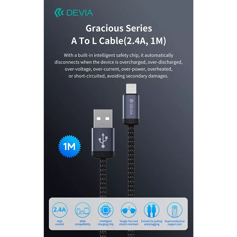 Devia - 1 metre (2.4A) Mesh Armour USB to Non-MFi Lightning Cable - Black